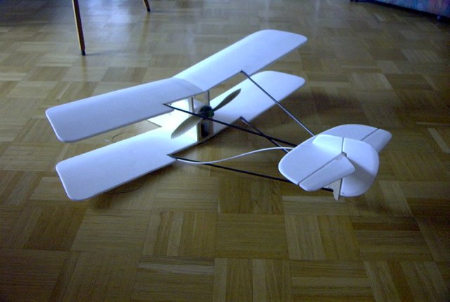Flügel aus 6mm Depron mit jeweils acht Balsarippen pro Flügel, unten offenens Profil, Flügelstile aus 3mm Balsaholz, Verspannung aus Takelagegarn.