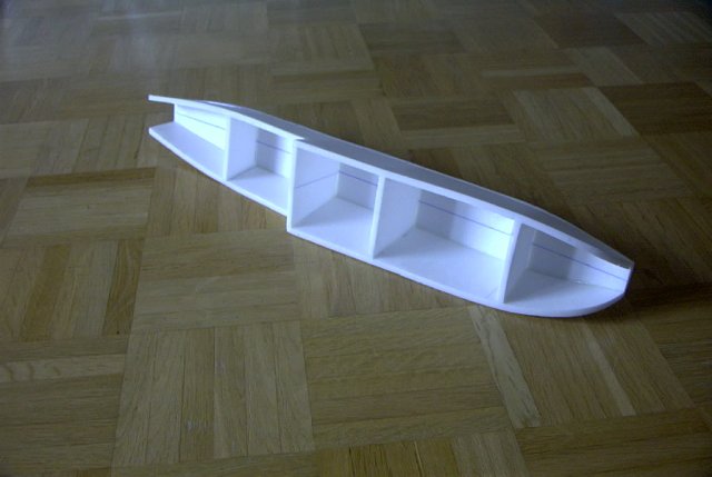 Der Rohbau des Zentralschwimmers. Durch den klassischen Spanten-Aufbau ist er sehr leicht. Wollen wir hoffen, dass die Verklebungen (Epoxy) auch dicht sind...