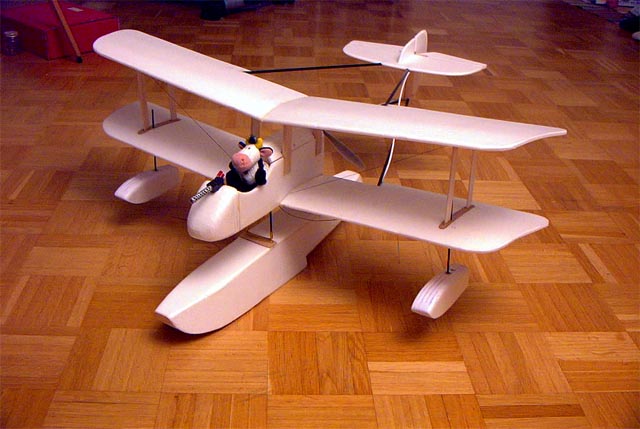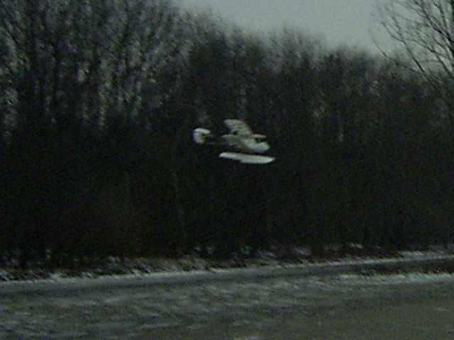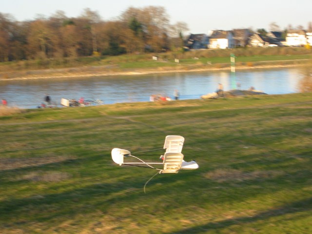 Hier sind die kleinen Rippen unter den Flügeln schön zu erkennen. In dieser Konfiguration (ohne Schwimmer) fliegt die Kiste wie an der Schnur gezogen. Aber trotz ihres geringen Gewichts hat sie Gleiteigenschaften wie ein Backstein. Man muss immer schön mindestens Halbgas geben, damit sie in ihrem Element bleibt. Versuche mit einem schwächeren aber wesentlich sparsameren Antrieb laufen gerade...