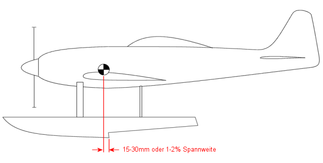 Die Position der Stufe bestimmt sehr stark die Gleiteigenschaften. Üblicherweise sollte die Stufe 1-2% der Flügelspannweite hinter dem Schwerpunkt des Flugzeugs liegen. Dadurch ist zwar der Widerstand etwas höher als wenn die Stufe vor dem Schwepunkt liegt, aber das Flugzeug gleitet deutlich stabiler. Liegt die Stufe vor dem Schwerpunkt muß meistens mit dem Höhenruder feinfühlig die Lage um die Querachse kontrolliert werden.