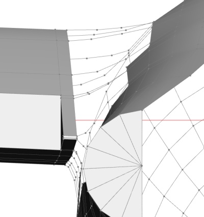 Anschliessend füllt man die Lücken mit vorzugsweise rechteckigen Polygonen. In einigen Ecken wird man sicher auch mal das ein oder andere Dreieckspolygon verwenden, die Rechteckpolygone erzeugen aber etwas glattere Flächen, wenn sie nicht zu stark verdreht sind.